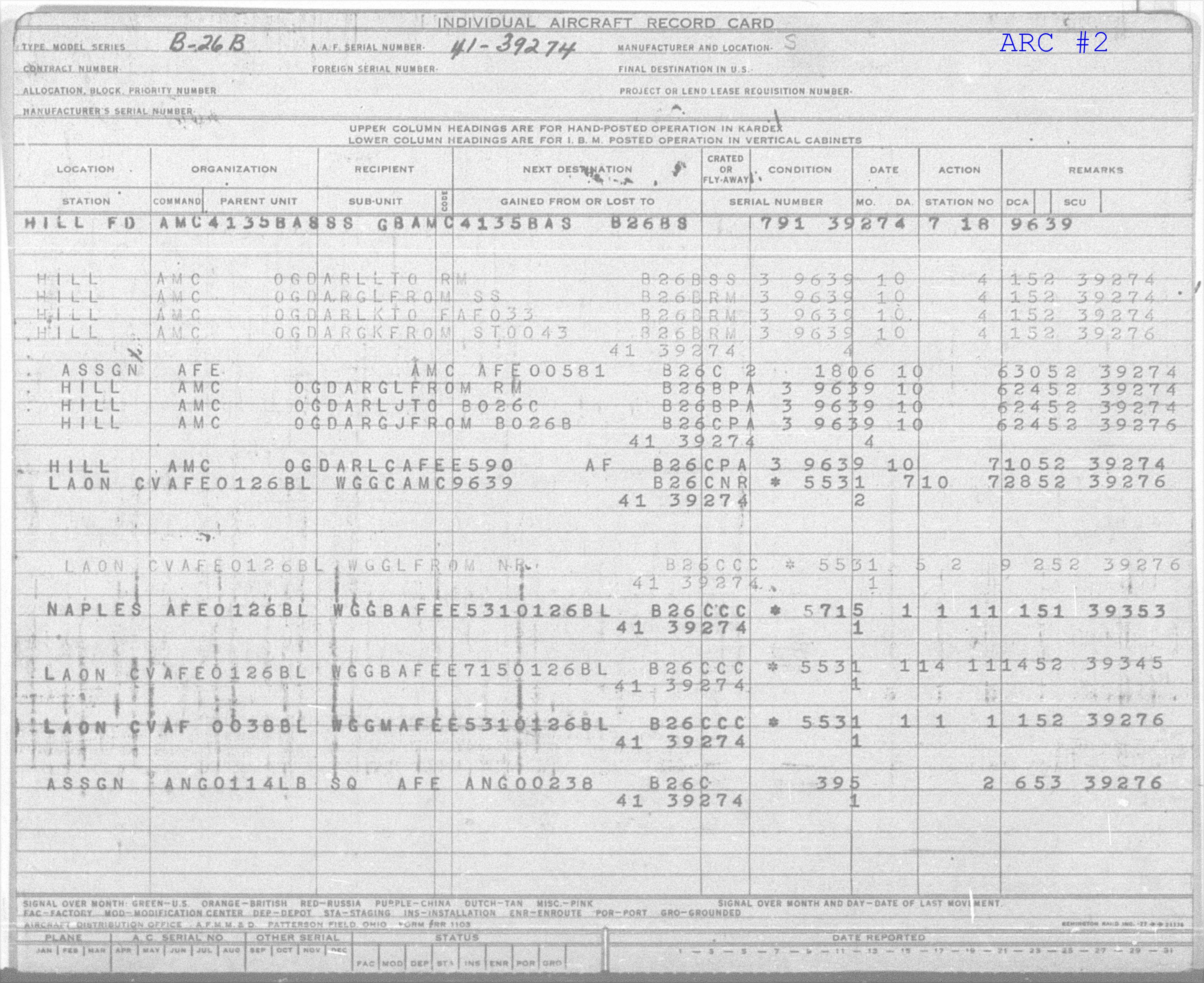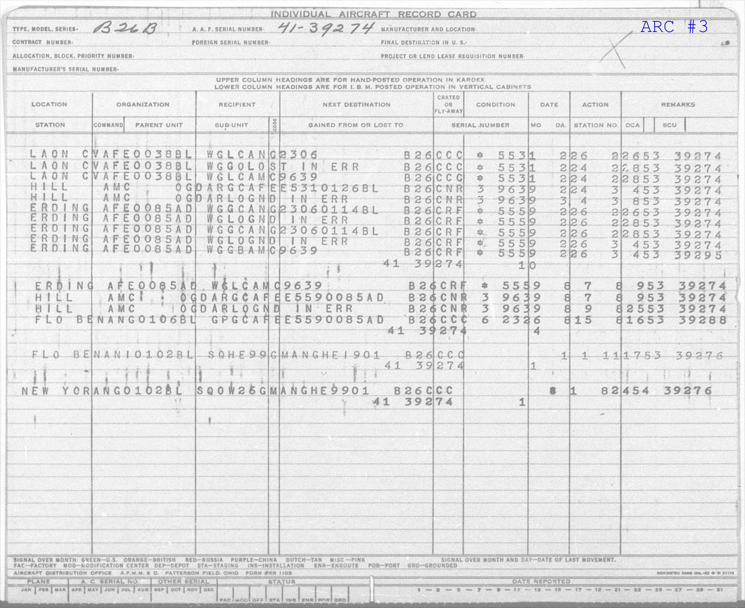 "ASSGN" = Hill Air Force Base, UT [REPORTING STATION]"AFE" = US Air Forces Europe [REPORTING UNIT (Command)] "AMC" = Air Materiel Command [GAINED FROM or LOST TO (Command)] "AFE00581" = Unknown [GAINED FROM or LOST TO (Sub-Command)] "B26C" = B26C [AIRCRAFT TYPE AND MODEL] "2" = Unknown [AMC AREA] "1806" = Unknown Station Number [REPORTING STATION NUMBER] "63052" = 30-Jun-1952 [DATE OF REPORT] "39274" = 41-39274 [NEXT IARC TO BE PRINTED] |