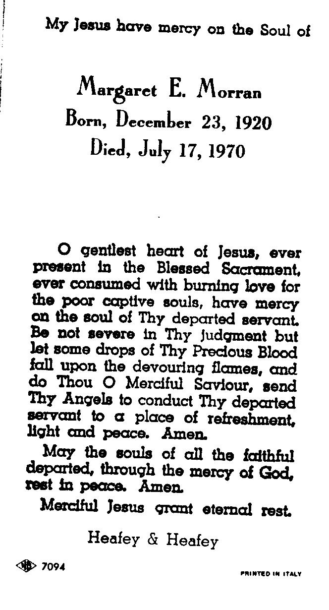 Moran, Margaret Elizabeth (Meehan), Prayer Card, 17 Jul 1970