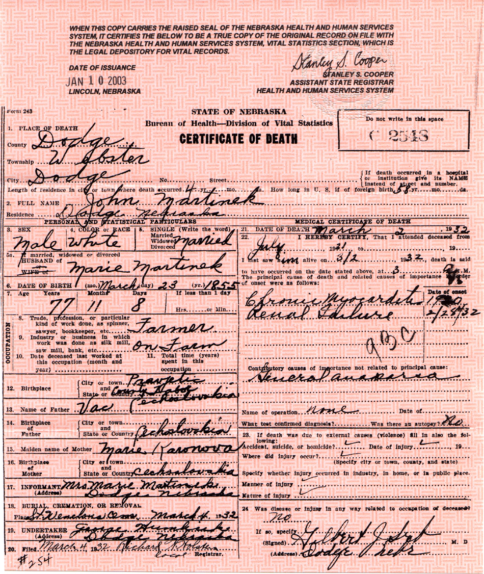 Martinek, John, Death Certificate, 2 Mar 1932